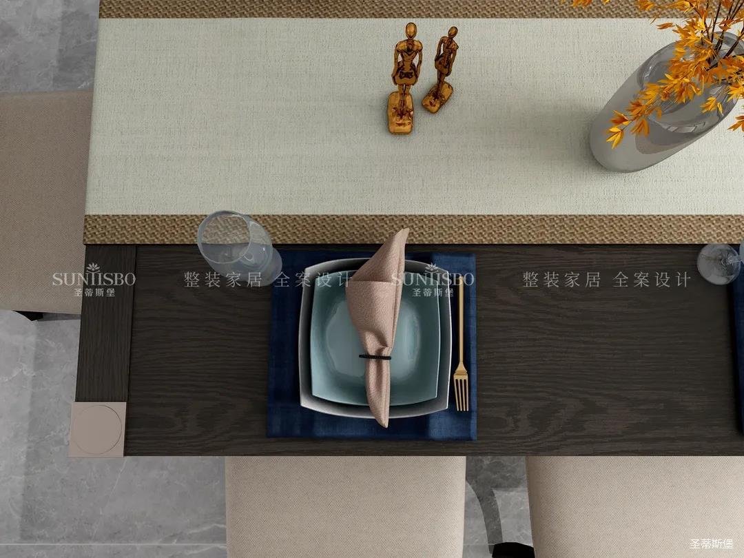餐厅和客厅以大横厅的形式展开,设计师将实木、玻璃、皮质、金属等看似相互排斥的元素相互重组,让餐厅呈现多元式的轻奢氛围。深浅色彩,对称型的定制柜,都让空间形成强有力的质感对比。无论是午餐窗外的车水马龙,还是晚宴的点点繁星,都能给屋主带来良好的就餐体验。